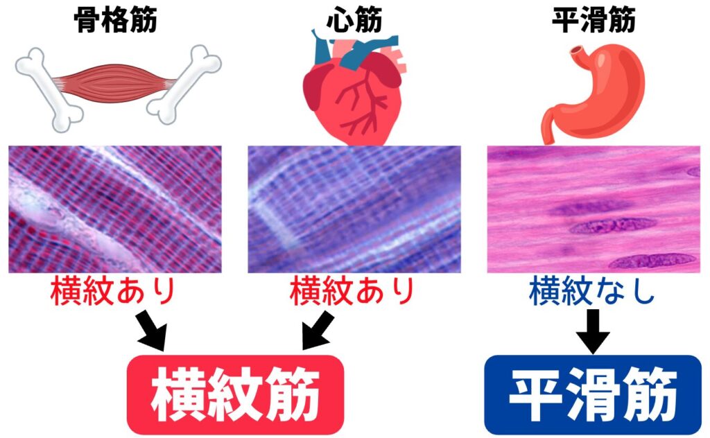 の2つの分け方でさらに横紋筋・随意筋・不随意筋に分けられます。