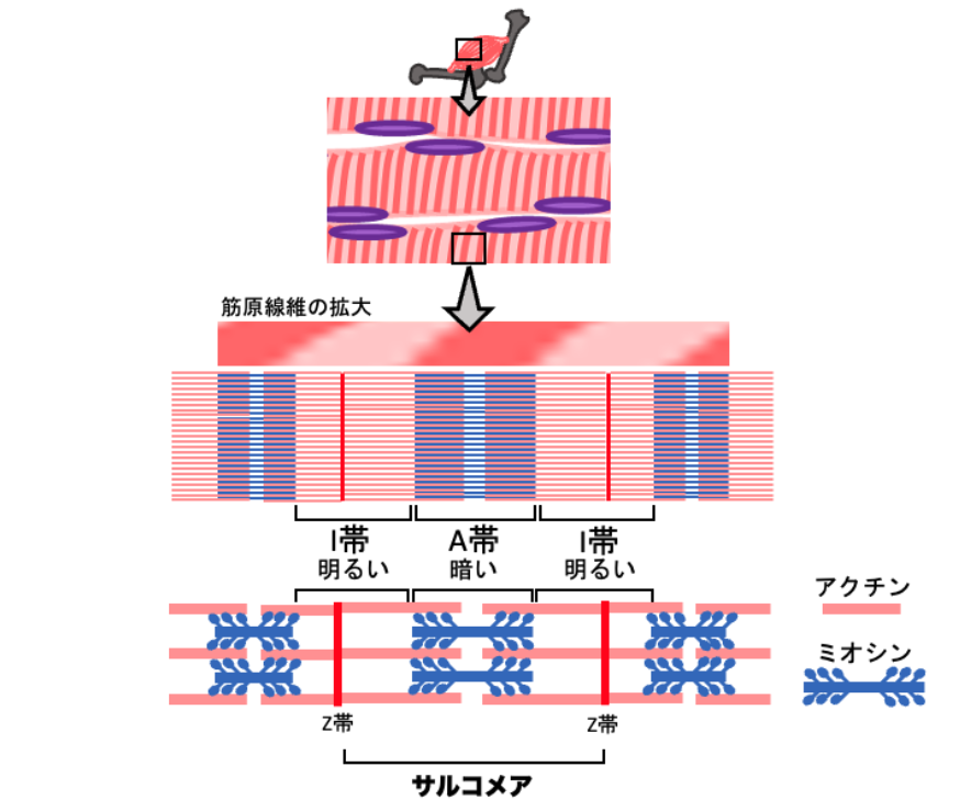 筋肉は基本的にアクチンとミオシンが集まった線維でできており、さらに集まって太くなっていったものです。