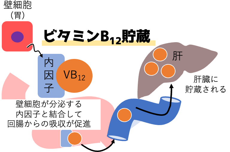 その後トランスコバラミンと結合して肝臓に運ばれて貯蔵されます。
