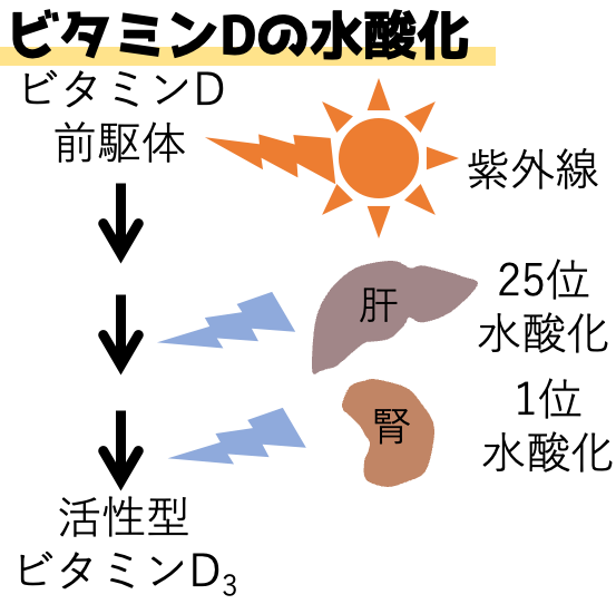 これが「活性型ビタミンD3」と呼ばれるもので、腸からのカルシウム吸収を促進したり、骨を丈夫にしたりするホルモンとしての作用します。