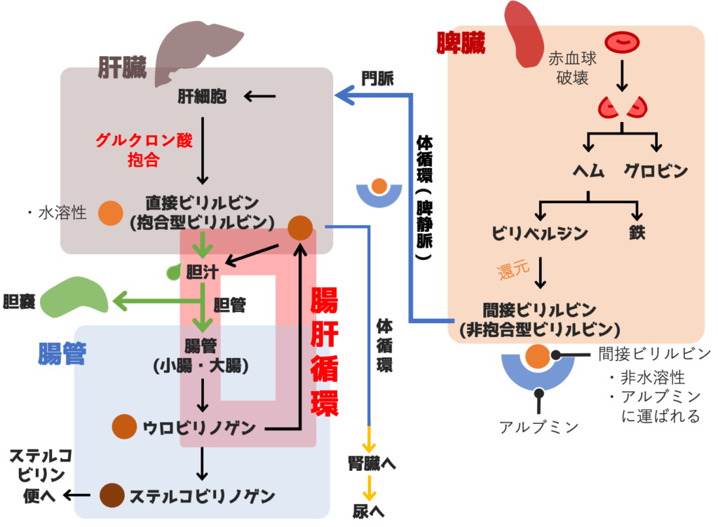 ウロビリノゲンは腸で再吸収されて、門脈を通って肝臓に戻り、再度胆汁の成分として胆管に排出されます。