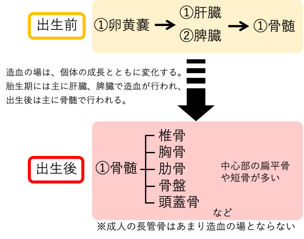 胎生後期から骨髄での造血が増え、出生後は骨髄が主体となっていきます。
