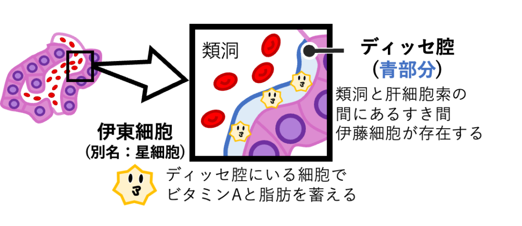 前述したように、肝臓にはディッセ腔と呼ばれる空間があり、そこに伊東細胞が存在してます。