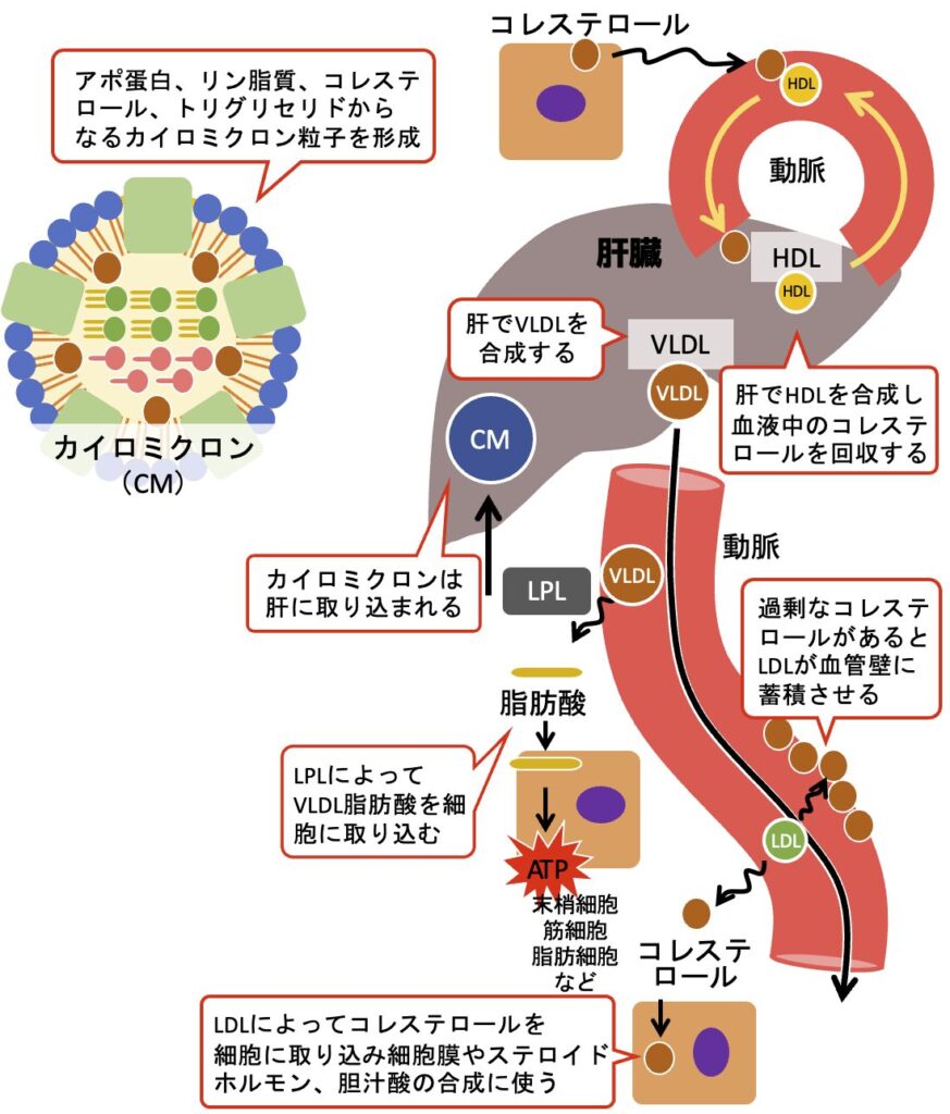 肝臓ではVLDLとHDLの2種類のリポ蛋白質を合成しています。