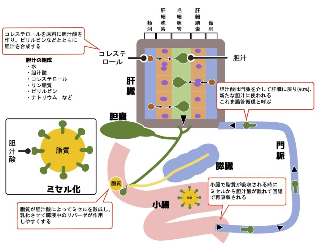 胆汁はコレステロールを原料にして胆汁酸を作り、その他のビリルビンなどと混ぜ合わされて作られます。