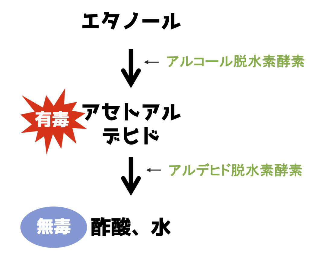 エタノールを代謝すると、有害なアセトアルデヒドが発生しますが、肝臓にあるアルデヒド脱水素酵素(ALDH)で無害な酢酸に分解し、最終的に水と二酸化炭素に変化します。