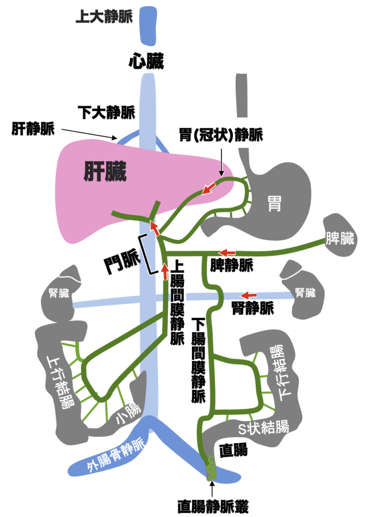 門脈には胃、小腸、大腸、膵臓、脾臓から出た毛細血管が集まってきます。