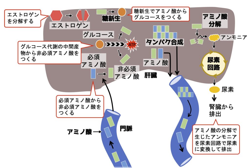 肝臓ではあらゆるアミノ酸やタンパク質代謝をおこなっています。
