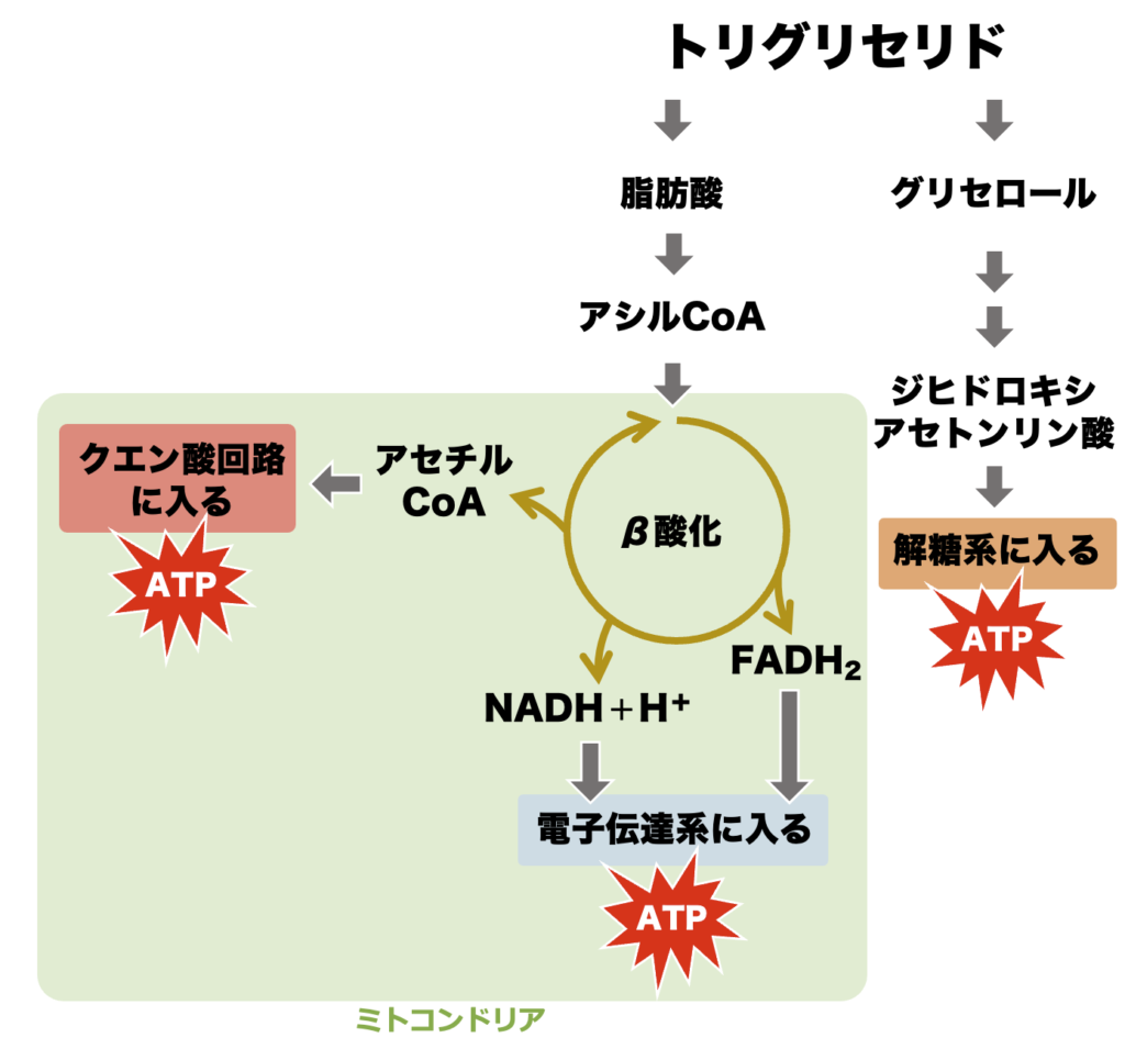 トリグリセリドから脂肪酸とグリセロールを取り出して、ATP(エネルギー)に変えることができます。