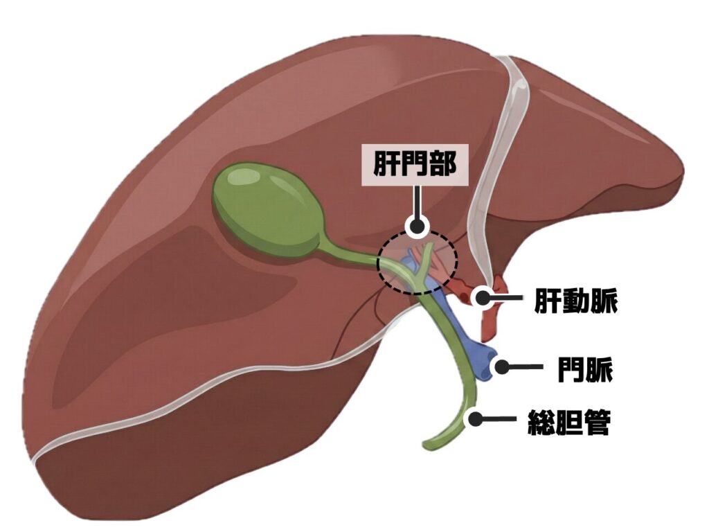 肝臓には【肝門部】と呼ばれる部分があり、そこから門脈、肝動脈、胆管(肝管)が出入りします。