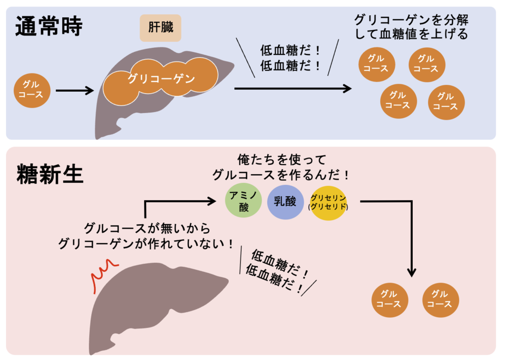 その場合アミノ酸や脂質など糖質以外から糖(グルコース)を生成します。