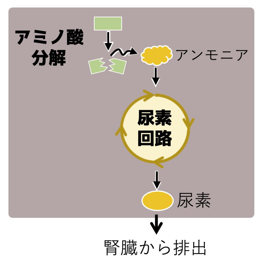 肝硬変などによって尿素に変換できない場合、有毒なアンモニアがそのまま脳へ到着し、危険な状態になります。