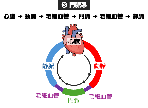 血管の流れは主に3種類あり、その中の一つに門脈系があります。