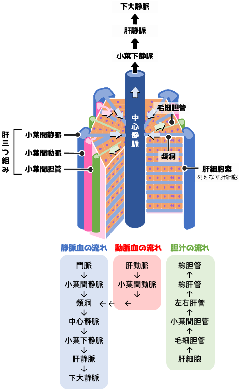 外から入ってきた門脈と動脈は小葉間静脈・動脈、そして類洞と呼ばれる血管となり、中心静脈に流れていきます。