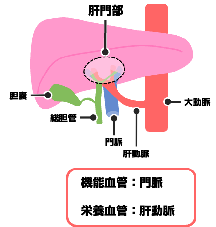 肝臓には門脈と肝動脈が入り、それぞれ栄養血管と機能血管とも呼ばれます。