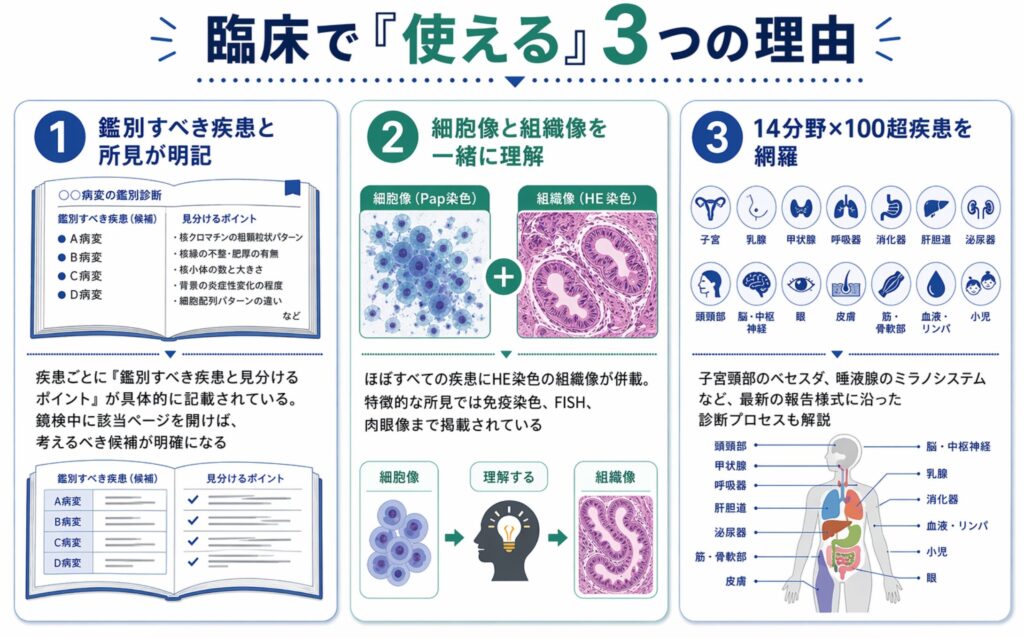 鑑別思考の基礎を身につけたい受験生にも、日々の鏡検でより正確な判断をしたい現場の方にも、手元に一冊あると確実に力になる本です。