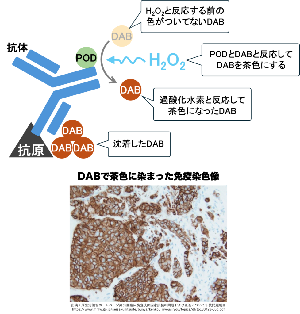 ペルオキシダーゼ(POD)による発色は、基質だけでなく過酸化水素(H2O2)も必要です。
